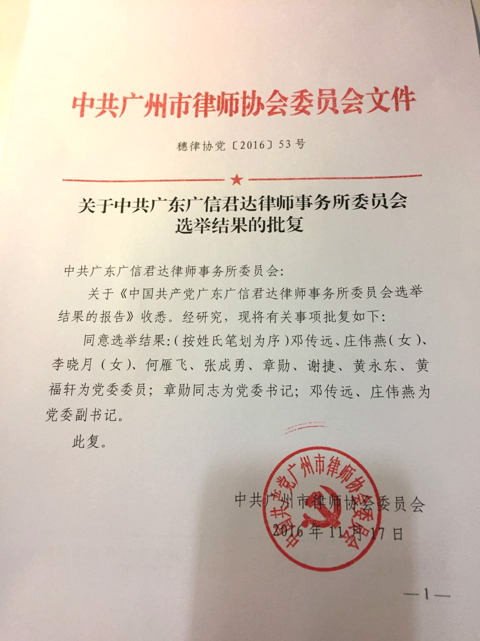2016年11月17日,中共廣州市律師協(xié)會委員會發(fā)布《關于中共廣東廣信君達律師事務所委員會選舉結果的批復》(穗律協(xié)黨【2016】53號),同意2016年11月4日中共廣東廣信君達律師事務所黨員大會選舉結果:(按姓氏筆劃為序)鄧傳遠、莊偉燕(女)、李曉月(女)、何雁飛、張成勇、章勛、謝捷、黃永東、黃福軒為黨委委員;章勛同志為黨委書記;鄧傳遠、莊偉燕同志為黨委副書記。