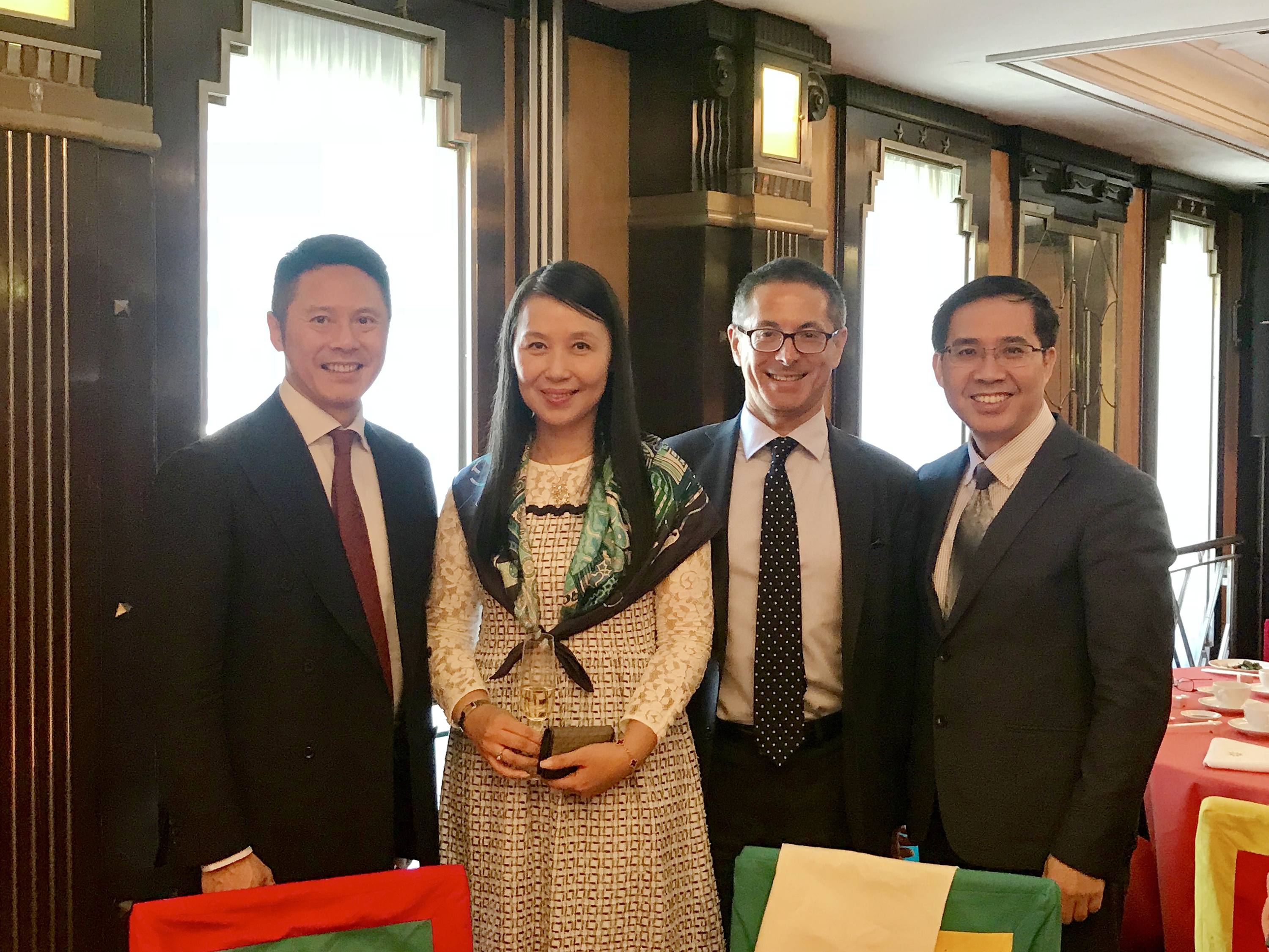 陳遠(yuǎn)樂(lè)律師、謝捷律師出席慶功宴,左一為香港律師事務(wù)Withers的合伙人Mike Suen,左二為上市保薦人Altus Holding Limited的執(zhí)行董事Jeanny Leung