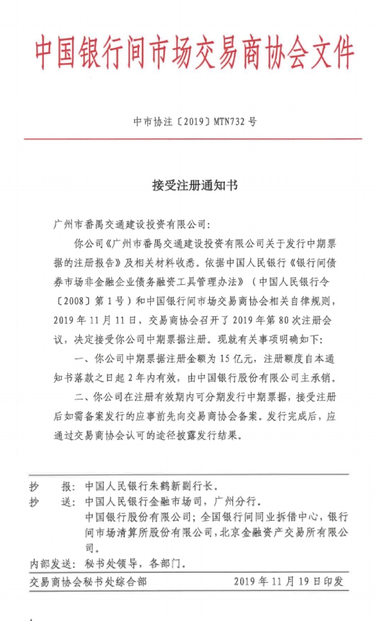 2019年11月19日,中國銀行間市場交易商協(xié)會出具《接受注冊通知書》(中市協(xié)注【2019】MTN732號),接受廣州市番禺交通建設(shè)投資有限公司(以下簡稱“番禺交投”)中期票據(jù)注冊,注冊金額為15億元,注冊額度為本通知書落款之日起2年內(nèi)有效,由中國銀行股份有限公司主承銷。
