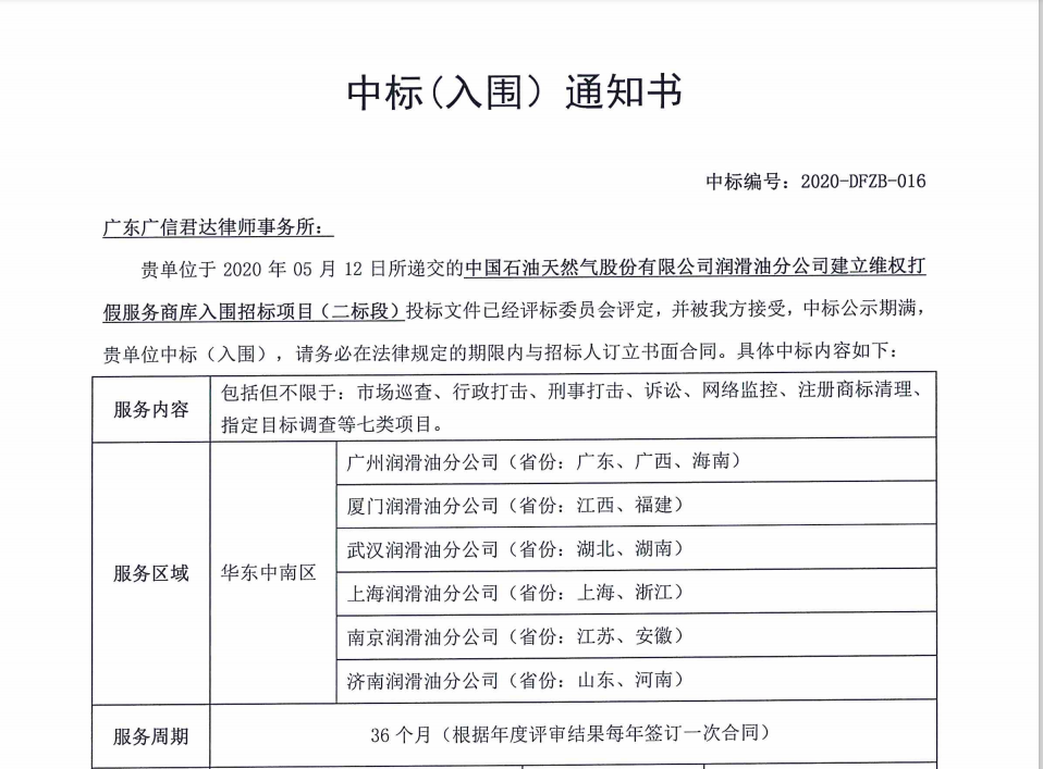 近日,廣信君達(dá)律師事務(wù)所順利中標(biāo)(入圍)中國(guó)石油天然氣股份有限公司潤(rùn)滑油分公司( 簡(jiǎn)稱“中國(guó)石油潤(rùn)滑油公司”)維權(quán)打假服務(wù)商庫(kù),指派本所曾建新律師團(tuán)隊(duì)、蘇東海律師團(tuán)隊(duì)、余鳳玲律師組成的服務(wù)項(xiàng)目組在華東中南區(qū)(省份包括:廣東、廣西、海南、福建 、湖北、湖南、上海、江蘇、浙江、安徽 、江西、山東、河南)為該單位提供維權(quán)打假法律服務(wù)。