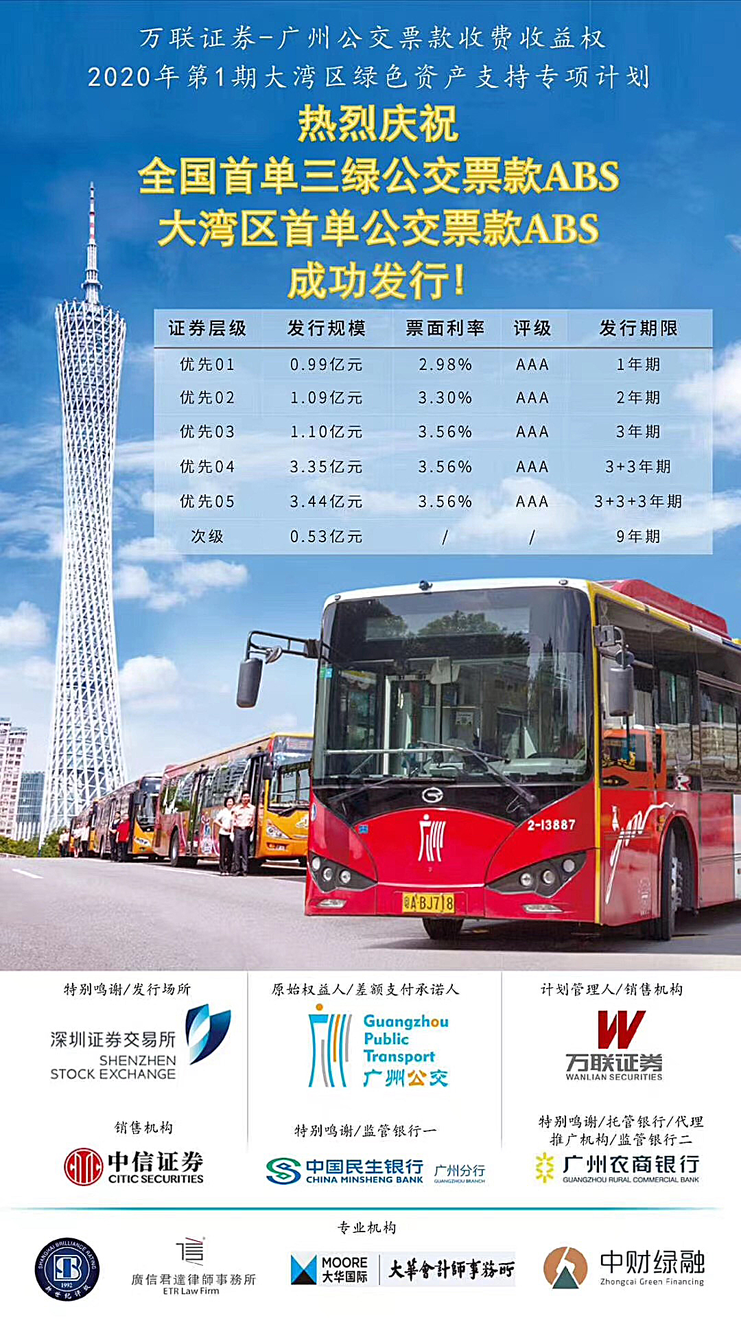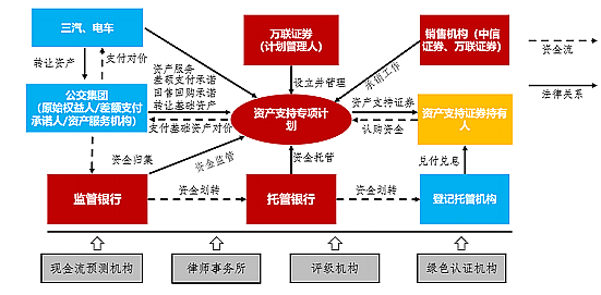 2020年7月30日,在廣州市國(guó)資委、深圳證券交易所的大力支持與指導(dǎo)下,由萬(wàn)聯(lián)證券擔(dān)任管理人的“萬(wàn)聯(lián)證券-廣州公交票款收費(fèi)收益權(quán)2020年第1期大灣區(qū)綠色資產(chǎn)支持專項(xiàng)計(jì)劃”成功發(fā)行,發(fā)行規(guī)模為10.5億元。本專項(xiàng)計(jì)劃是國(guó)內(nèi)首單“三綠”( 綠色主體+綠色基礎(chǔ)資產(chǎn)+綠色募集資金用途)公交票款收費(fèi)收益權(quán)ABS,同時(shí)也是粵港澳大灣區(qū)首單公交票款收費(fèi)收益權(quán)ABS。本專項(xiàng)計(jì)劃的交易結(jié)構(gòu)圖如下: