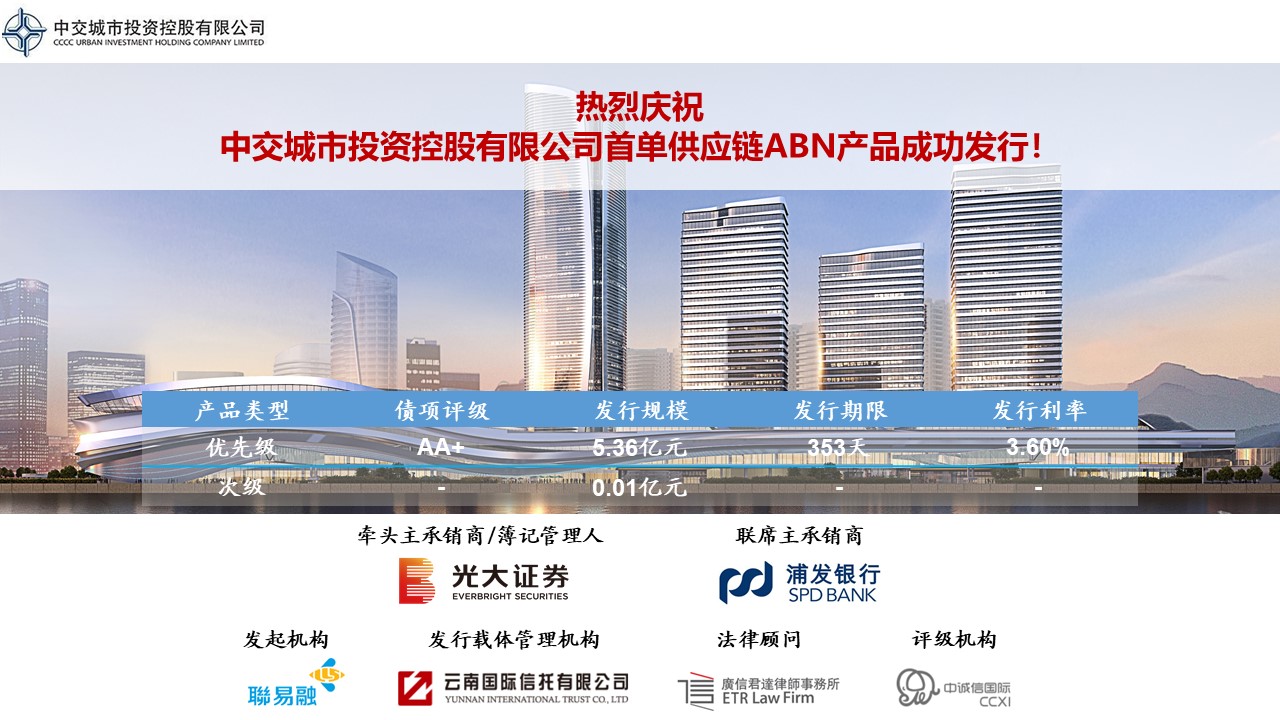 2020年9月21日,聯(lián)捷保理2020年度第一期中交城投供應(yīng)鏈應(yīng)付賬款資產(chǎn)支持票據(jù)成功發(fā)行,發(fā)行規(guī)模為5.37億元人民幣。其中,優(yōu)先級(jí)發(fā)行規(guī)模為5.36億元,發(fā)行利率為3.60%,次級(jí)發(fā)行規(guī)模為0.01億元,發(fā)行期限為353日。后續(xù)將擇機(jī)在注冊(cè)額度內(nèi)分期發(fā)行。