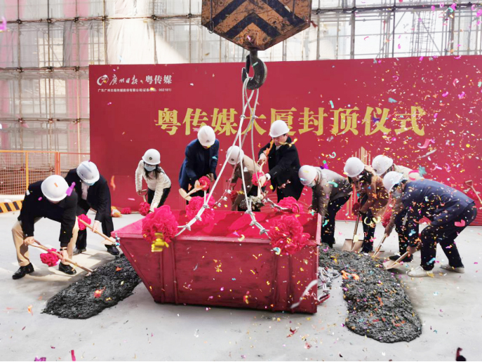 封頂儀式上,張強(qiáng)董事長宣布粵傳媒大廈主體結(jié)構(gòu)正式封頂,全場掌聲響起。出席儀式的領(lǐng)導(dǎo)及嘉賓共同為項目主體結(jié)構(gòu)封頂澆注最后一方混凝土,眾多社會人士通過網(wǎng)絡(luò)直播見證這一歷史性時刻。粵傳媒大廈主體結(jié)構(gòu)封頂儀式慶典標(biāo)志著項目建設(shè)取得重要的階段性成果,為保證后續(xù)施工的順利推進(jìn)奠定基礎(chǔ)。