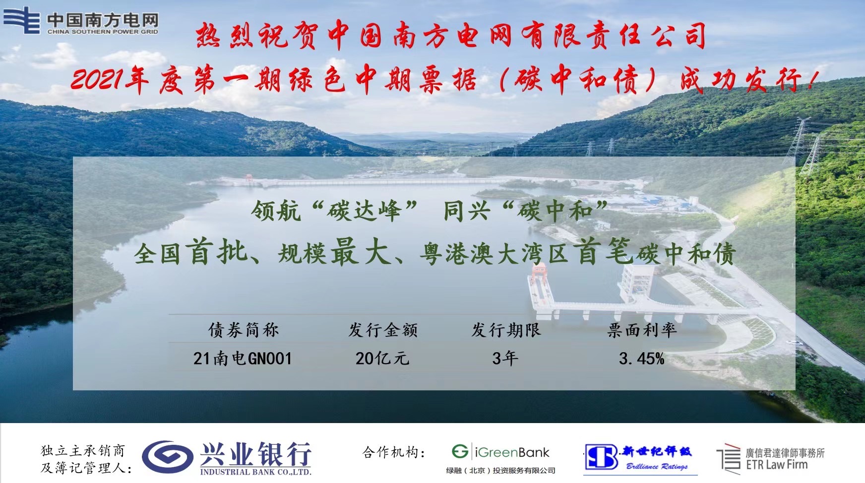 2021年2月7日,中國(guó)南方電網(wǎng)有限責(zé)任公司2021年度第一期綠色中期票據(jù)(碳中和債)成功發(fā)行,發(fā)行規(guī)模為20億元人民幣,發(fā)行期限為3年,發(fā)行利率為3.45%。本次碳中和債的主承銷(xiāo)商為興業(yè)銀行股份有限公司,評(píng)估認(rèn)證機(jī)構(gòu)為綠融(北京)投資服務(wù)有限公司,廣信君達(dá)律師事務(wù)所擔(dān)任本次項(xiàng)目的專(zhuān)項(xiàng)法律顧問(wèn)。