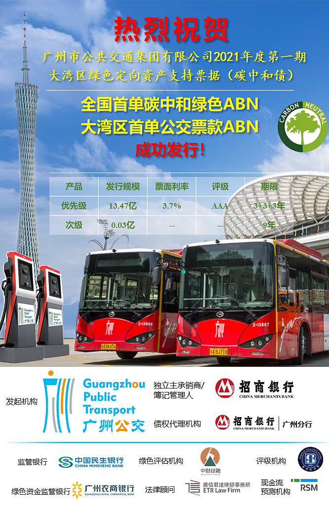 2021年3月23日,在廣州市國資委、中國銀行間市場交易商協(xié)會的大力支持與指導(dǎo)下,廣州市公共交通集團有限公司(以下簡稱“廣州公交集團”)2021年度第一期大灣區(qū)綠色定向資產(chǎn)支持票據(jù)(碳中和債)(以下簡稱“項目”)成功發(fā)行,發(fā)行規(guī)模為13.5億元。該項目不僅是全國首單碳中和綠色ABN,還是大灣區(qū)首單公交票款資產(chǎn)支持票據(jù)。本次發(fā)行,各機構(gòu)踴躍認購,最后以3.70%票面利率超募成功發(fā)行,低于同期AAA評級3年期企業(yè)資產(chǎn)支持證券到期收益率36BPs,創(chuàng)2021年以來同類資產(chǎn)證券化產(chǎn)品新低,展現(xiàn)出極佳的示范效應(yīng)與極高的市場認可度。