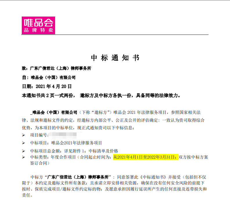 本次中標,是對廣信君達法律服務(wù)水平的肯定,總所及上海分所將繼續(xù)秉持“效率、信任、責任”的核心理念,以積極認真的工作態(tài)度,為唯品會提供優(yōu)質(zhì)、高效的法律服務(wù)。