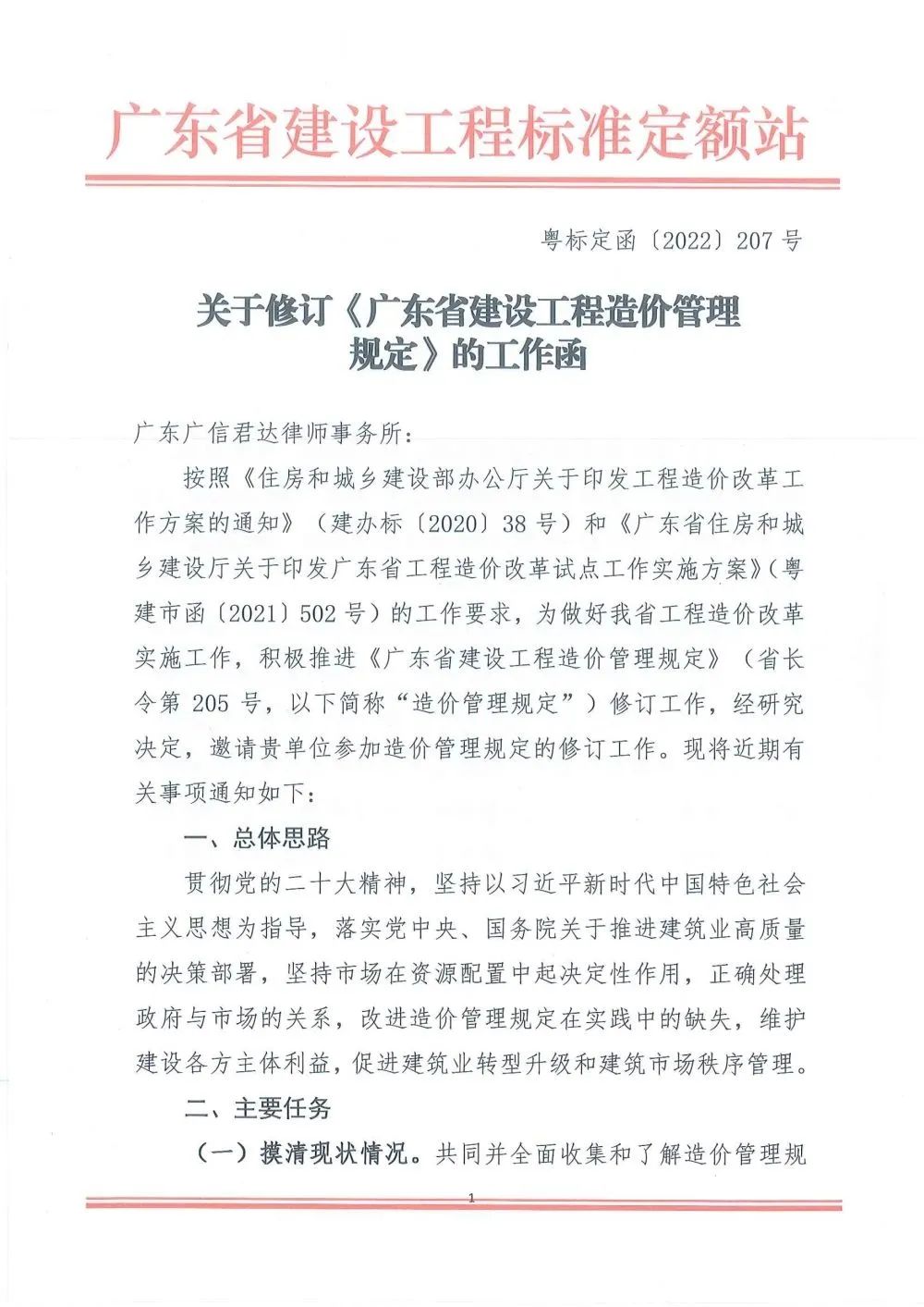 2022年11月23日,廣東省建設(shè)工程標(biāo)準(zhǔn)定額站按照《住房和城鄉(xiāng)建設(shè)部辦公廳關(guān)于印發(fā)工程造價(jià)改革工作方案的通知》(建辦標(biāo)(2020)38號(hào))和《廣東省住房和城鄉(xiāng)建設(shè)廳關(guān)于印發(fā)廣東省工程造價(jià)改革試點(diǎn)工作實(shí)施方案》(粵建市函(2021)502號(hào))的工作要求,為做好廣東省工程造價(jià)改革實(shí)施工作,積極推進(jìn)對(duì)《廣東省建設(shè)工程造價(jià)管理規(guī)定》(省長(zhǎng)令第205號(hào),簡(jiǎn)稱“造價(jià)管理規(guī)定”)的修訂,廣信君達(dá)律師事務(wù)所受邀參與造價(jià)管理規(guī)定的修訂工作。